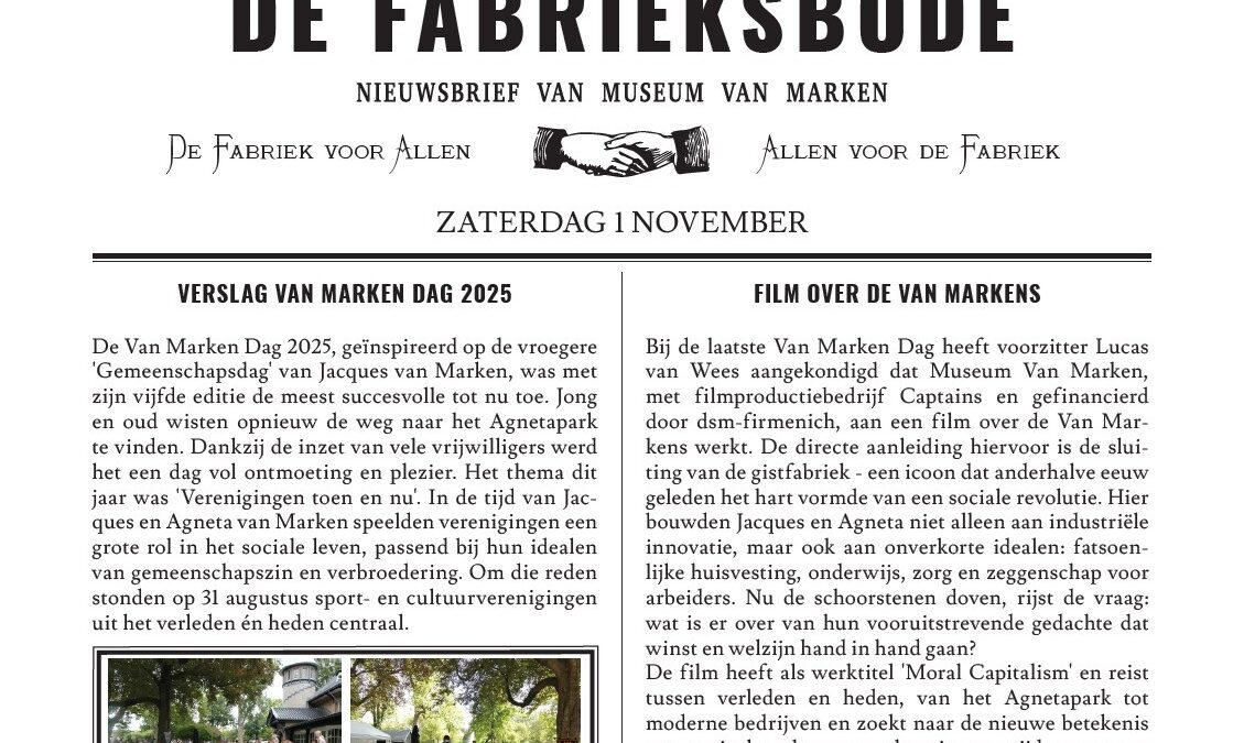 In dit nummer vindt u een kort verslag van de vijfde Van Marken Dag die op zondag 31 augustus werd gehouden in het Agnetapark. Als u meer foto’s wilt zien moet u zeker even doorklikken via de link naar onze website. We kijken in elk geval terug op een geweldige dag en een geslaagd programma. Verder vindt u in deze nieuwe De Fabrieksbode een aantal andere wetenswaardigheden, waaronder een bericht over de film waar op dit moment aan gewerkt wordt. Van onze actie dat nieuwe Jaarlijks Vrienden het boek ‘Ieder uur een woord, een daad’ ontvangen hebben velen al gebruikgemaakt. U kunt nog tot 15 februari meedoen aan deze actie. Zet uw eenmalig Vriendschap om in Jaarlijks Vriend en u ontvangt het boek.