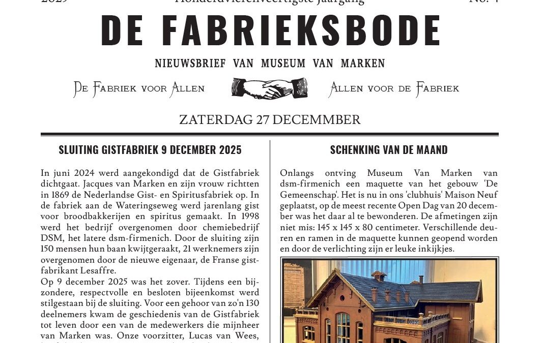 Er is sinds de vorige Fabrieksbode veel gebeurd, vandaar dat op de valreep van het jaar nog een vierde De Fabrieksbode is verschenen. Een heel belangrijke gebeurtenis was de officiële beëindiging van de gistproductie door dsm-firmenich in Delft. Een delegatie van Museum Van Marken mocht hierbij aanwezig zijn. Ook bijzonder was dat de – misschien voor u bekende – maquette van het gebouw ‘De Gemeenschap’ in het Agnetapark aan Museum Van Marken is geschonken door dsm-firmenich. Van beide gebeurtenissen vindt u een verslag in deze Fabrieksbode. Ook in deze Fabrieksbode aandacht voor de Zakelijke Vrienden en voor de steun die zij ons ook dit jaar weer hebben gegeven.