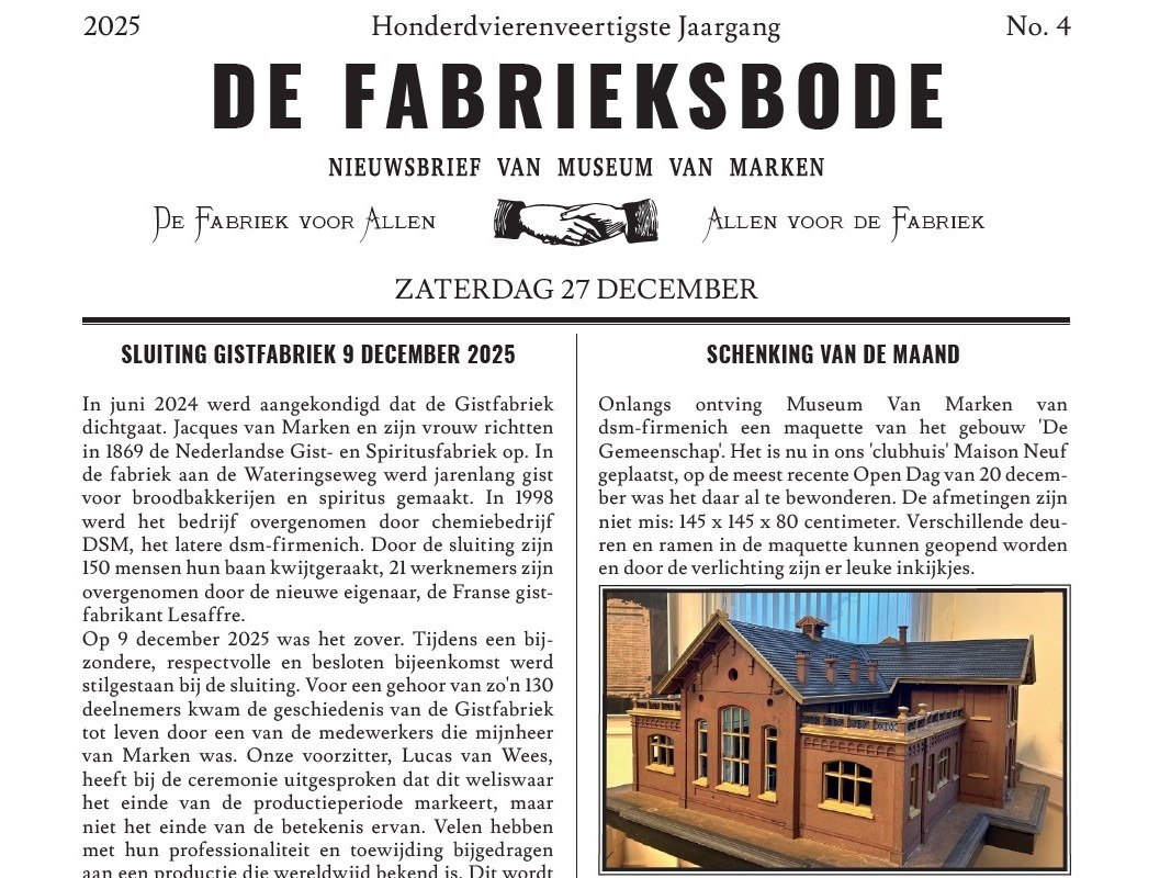 Door middel van ‘De Fabrieksbode’ brengen we Vrienden op de hoogte van de laatste ontwikkelingen. Museum Van Marken gebruikt hiervoor het format van ‘De Fabrieksbode’, het weekblad dat Jacques van Marken uitbracht ‘voor en van het personeel’ van zijn fabrieken.
