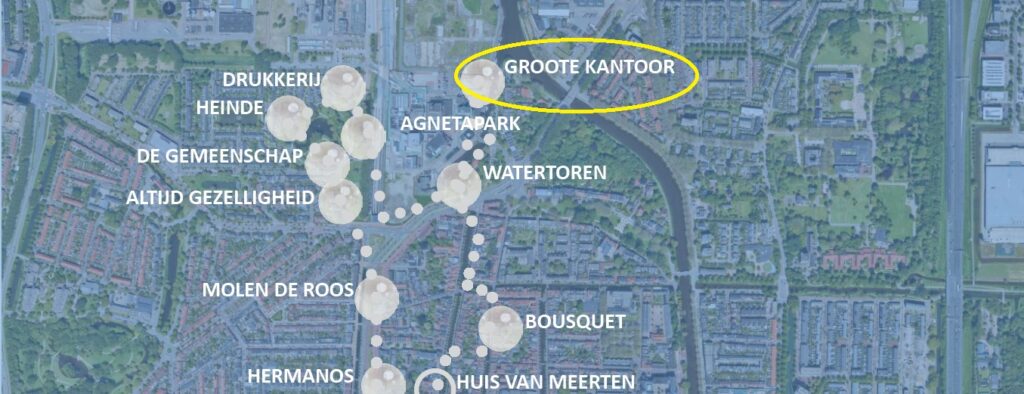 Actueel: Bij het Groote Kantoor is een tentoonstelling te zien op de bouwhekken met informatie over de geschiedenis van Jacques en Agneta, het Groote Kantoor en de herbestemming ervan door BOEi.